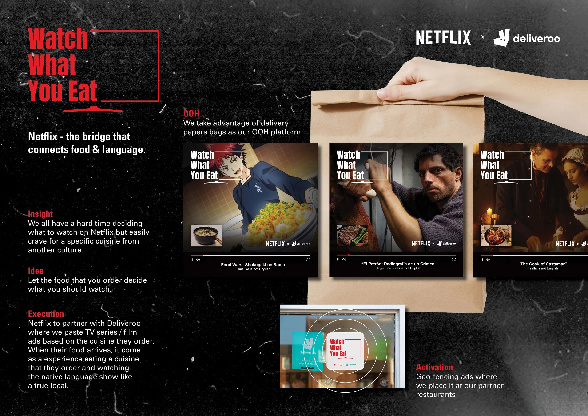 We all have a hard time deciding what to watch on Netflix, but we easily crave food. So, we launch an integrated campaign called “Watch what you eat” to let the food that we order decide what we should watch. Netflix to partner with Deliveroo where we will paste ad print suggestions of TV series / films on what to watch. When the food arrives, it comes as a complete experience of eating and watching a foreign show. We will also create a Geo-fencing activation around our partner restaurants, where more series/films will be suggested when you are nearby. We believe that Netflix is the bridge that connects food and language.
